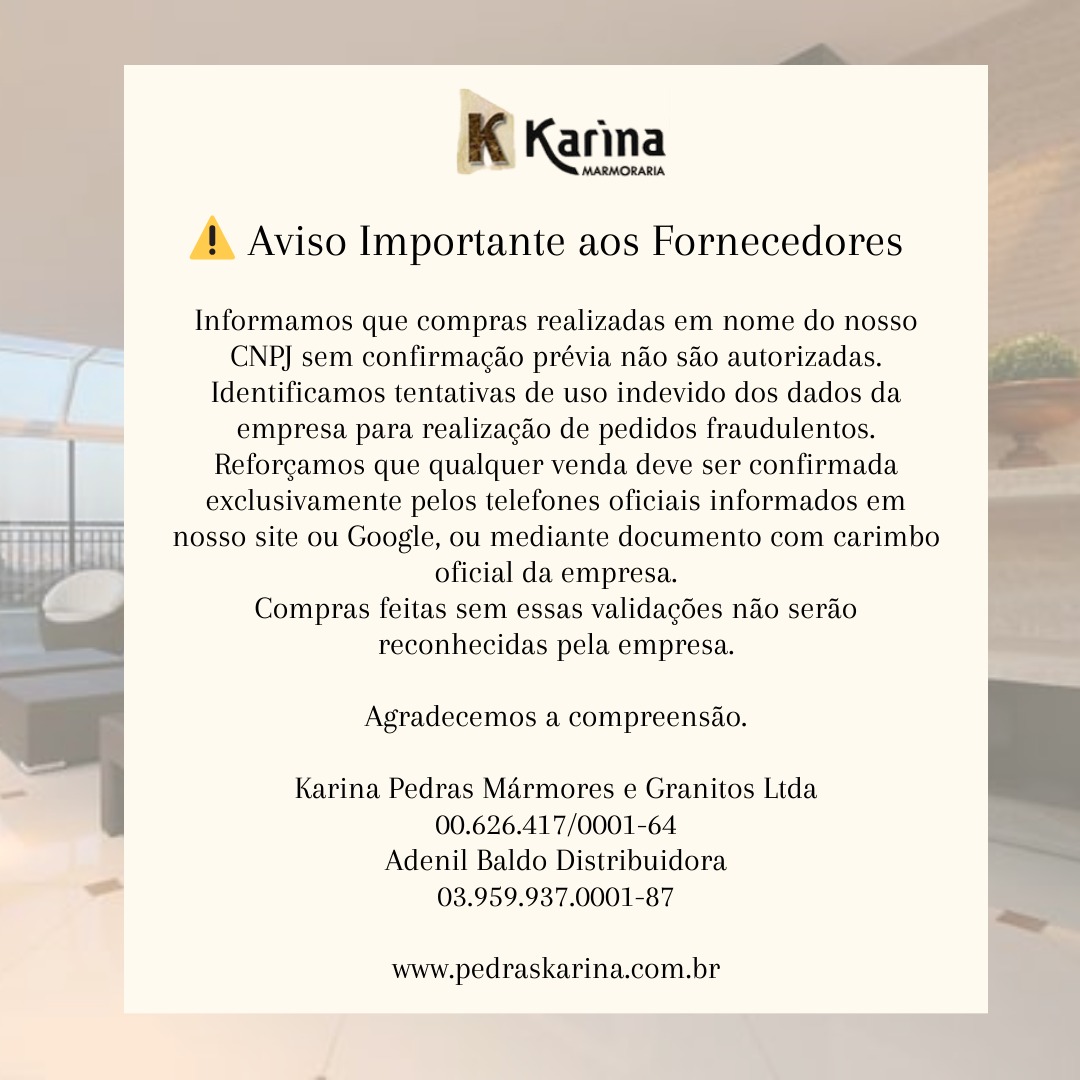 Publicado em Kenia DuarteTrustindex verifica se a fonte original da avaliação é Google. Comprei todas as pedras da minha casa, na pedras Karina e desde a vendedora até o proprietário todos me trataram com excelência, são pessoas muito honestas e que sabem valorizar os clientes! É uma empresa que com certeza voltaria a comprar e indicaria meus amigos e parentes!Publicado em Dilma NovaesTrustindex verifica se a fonte original da avaliação é Google. Se eu recomendo a empresa Pedra Karina? Sim e sim. Excelente atendimento, boas informações técnicas, conhecimentos importantes sobre o produto que eu adquirir, compromisso e responsabilidade sobre suas falas e as minhas necessidades. Eu recomendo,sim.Publicado em Beatriz VilaçaTrustindex verifica se a fonte original da avaliação é Google. Adeniu foi muito atencioso com o nosso pedido. Respeitou o prazos e nos ajudou em absolutamente tudo. Recomendo muito!Publicado em Ana Claudia BessaTrustindex verifica se a fonte original da avaliação é Google. Empresa Maravilhosa, o atendimento espetacular estou completamente feliz super indico elesPublicado em Werônica ArcanjoTrustindex verifica se a fonte original da avaliação é Google. Eu comprei e recomendo bom preço ótimo atendimento gosteiPublicado em Ronaldo ValerioteTrustindex verifica se a fonte original da avaliação é Google. Fizemos vários orçamentos na região da zona Sul e Pedras Karina foi a mais em conta. Serviço impecável, escolhemos o mármore branco Paraná e ficou fantástico. A ilha ficou um show a parte. Super recomendamos, procurem a Cida por lá!!Publicado em Icaro CastroTrustindex verifica se a fonte original da avaliação é Google. Se você procura bom atendimento e qualidade de material e honestidade de serviço está no lugar certo e preço justo por em serviço fino a verdadeira obra de arte em pedras . Dês do primeiro atendimento da Fabiana aos instaladores excepcional . Supera todas nossas espectativas Parabéns há Mamoraria GuarapirangaPublicado em Pr. Agnaldo GaristoTrustindex verifica se a fonte original da avaliação é Google. Espetacular. Sou cliente a quase 30 anos. Excelente atendimento. Profissional é muita qualidade técnica. Indico para quem quiser adquirir produtos com ela.Publicado em Garistour GaristourTrustindex verifica se a fonte original da avaliação é Google. Excelente empresa. Preço, qualidade e pontualidade. Indico sem qualquer sombra de dúvidas.